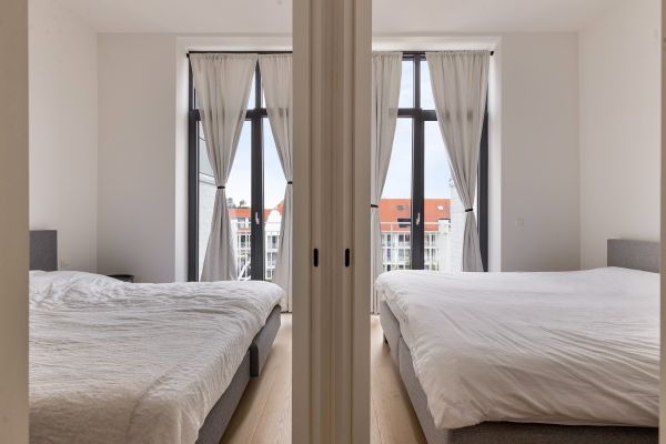 - Twee slaapkamers: Beide slaapkamers (geschikt voor een dubbel bed) liggen aan de noordkant en kijken uit op een unieke, mooi aangelegde binnentuin. Beide hebben bovendien toegang tot een eigen terras.
