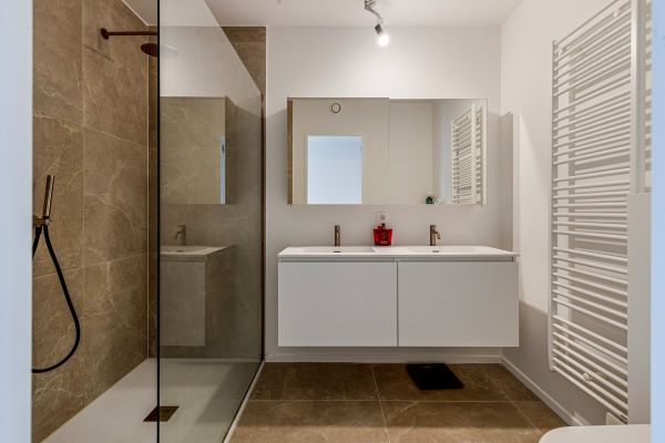- Luxueuze badkamer: Uitgerust met een inloopdouche en dubbele wastafel.